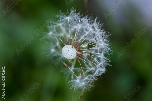 © Igor, Fototapeta premium Half flown dandelion close up on green background