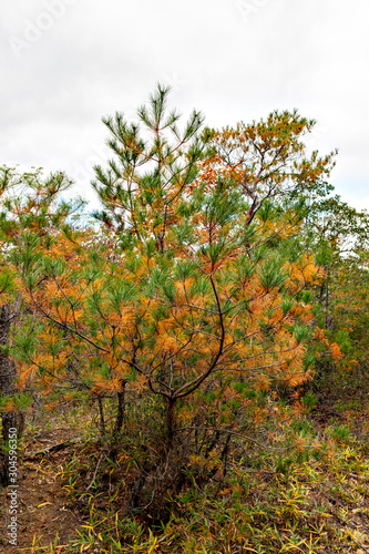 Fototapeta premium Half green and half brown pine tree leaves in the mountain in Japan in autumn