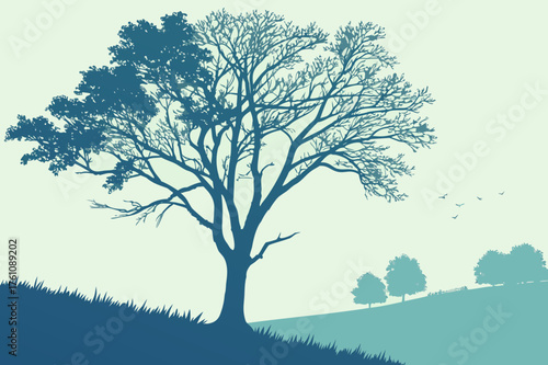 © Md, Fototapeta premium Half-Lush, Half-Bare Tree Silhouette Vector in Hilly Duotone Landscape