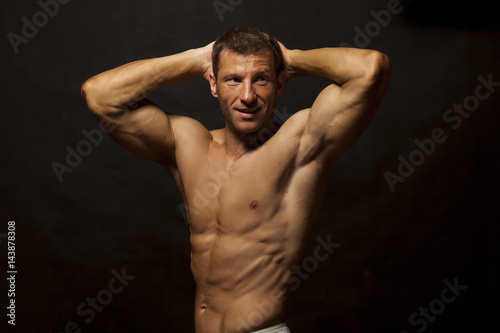 © vladimirfloyd, Fototapeta premium half-naked handsome and muscular young man posing on a dark background