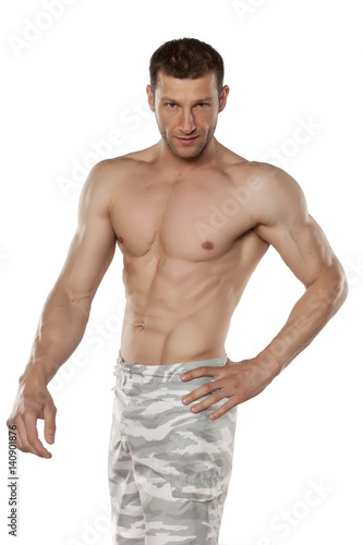 Fototapeta premium half-naked handsome and muscular young man posing on a white background