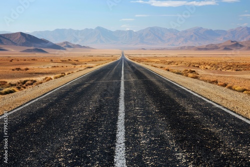 © Popelniushka, Fototapeta premium Halfway There on Desert Road. Journeying towards Success, Completing Objectives, and Achieving