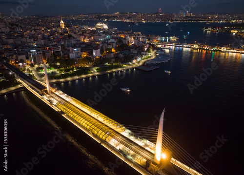 © raul77, Fototapeta premium Halic Metro Bridge in the Sunset Drone Photo, Galata Beyoglu, Istanbul Turkey