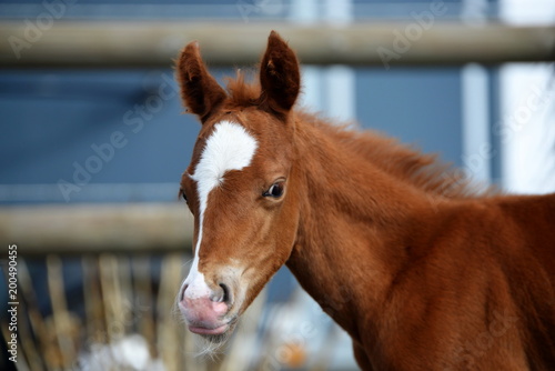 © Grubärin, Fototapeta premium Hallo world, cute 2 days young sorrel Quarter Horse foal in portrait