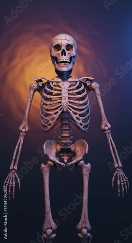 © HAZERA, Naklejka premium Halloween anatomical skeleton model standing against a swirling orange and blue, creating a dramatic and slightly eerie effect, perfect for educational or artistic purposes