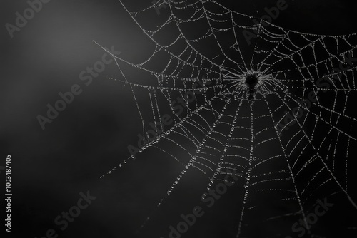 Fototapeta premium Halloween background. A delicate spider web glistens softly in the darkness, showcasing intricate patterns against a velvety black backdrop illuminated by gentle light