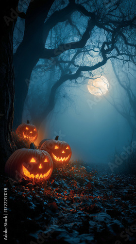 Naklejka premium Halloween background - Carved Orange Pumpkins with Glowing Faces in Dark Forest with Bare Trees and Full Moon in Night Sky.