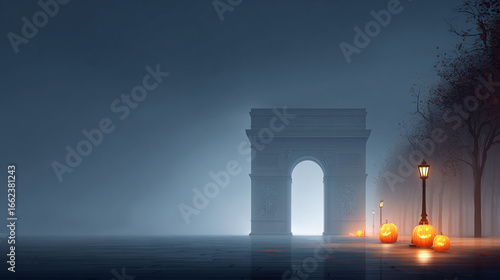 Naklejka premium Halloween background of pumpkin lanterns and open space in Paris