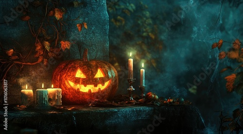 Naklejka premium Halloween background with burning candles and a carved pumpkin on a table, spooky witch background