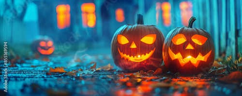 Fototapeta premium Halloween background with haunted looking, carved pumpkins in front of a...