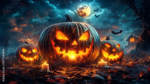 © Dmitrii, Naklejka premium Halloween background with pumpkins, candles and haunted house. Halloween night wallpaper design for poster, card or banne