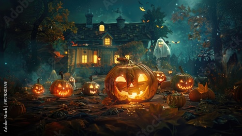 © Faith Stock, Naklejka premium Halloween background with pumpkins on the background of a haunted house with ghosts.