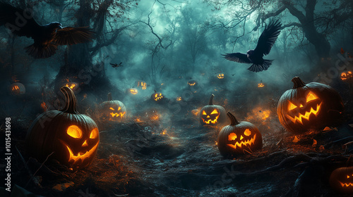 © Pixel World Vision , Fototapeta premium Halloween background with pumpkins, thick fog, pumpkin lanterns