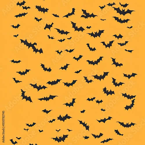 © MUdaylah, Naklejka premium Halloween banner, poster with black bats on the orange background. Template vector Illustration for text. Halloween background with swarm of bats on orange sky. with generative ai