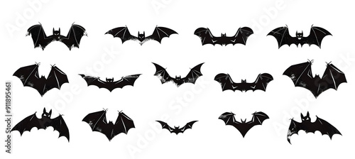 © Daniel, Naklejka premium Halloween bat silhouette set isolated on white background. Spooky black horror bat graphic. Vector illustration