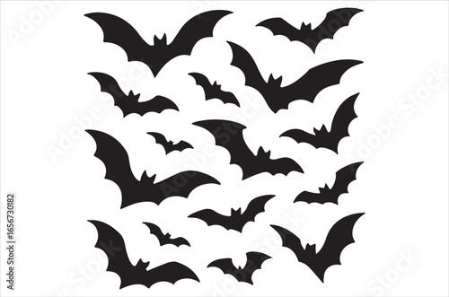 © Shapona, Naklejka premium Halloween bats silhouettes set. Isolated vector winged vampire animal black shapes on white background. Creepy and spooky fauna creatures group, monochrome icons, simple signs or pictograms