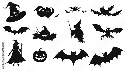 © Photo, Naklejka premium Halloween black silhouette vector icons featuring witches bats and pumpkins isolated on white