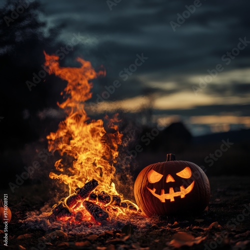 © Monchisa, Naklejka premium Halloween bonfire gathering, friends sharing spooky tales, glowing flames illuminating faces, autumn leaves surrounding, creating a warm, festive atmosphere under a starry sky