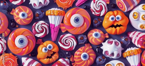 Fototapeta premium Halloween candy, eyes and mouth on the cover, simple flat cartoon style, colorful candy pattern