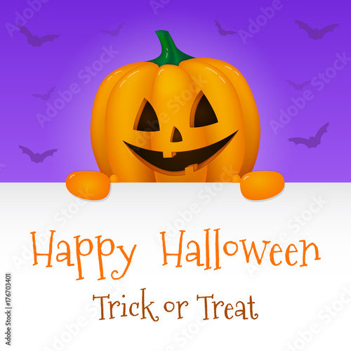 © Karolina Madej, Naklejka premium Halloween card with realistic scary pumpkin. Vector.