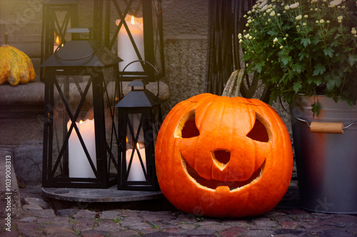Obraz premium Halloween carved pumpkin. Traditional holiday decorations