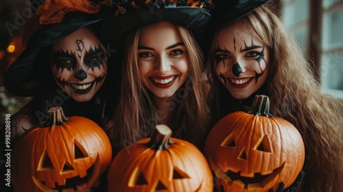 Fototapeta premium Halloween Celebrations with Witches and Pumpkins in an Autumn Forest Setting