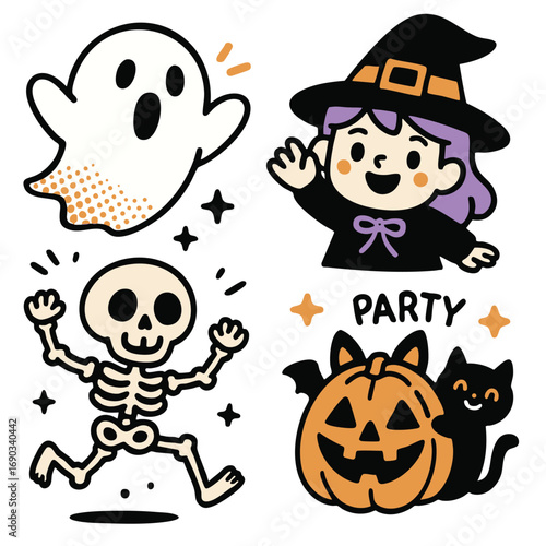 Fototapeta premium Halloween characters including ghost, witch, skeleton, pumpkin, and cat