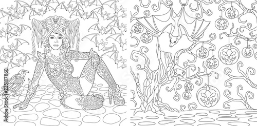 Fototapeta premium Halloween coloring pages with witch girl and flying bats