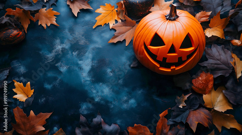 © Ryan, Fototapeta premium Halloween composition with jack-o'-lantern and autumn leaves on a moody blue background. Perfect for eerie holiday designs