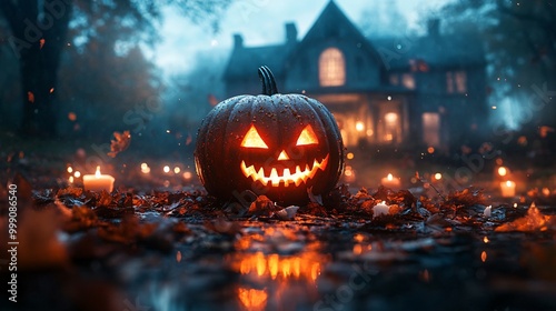Fototapeta premium Halloween concept with haunted house and pumpkin