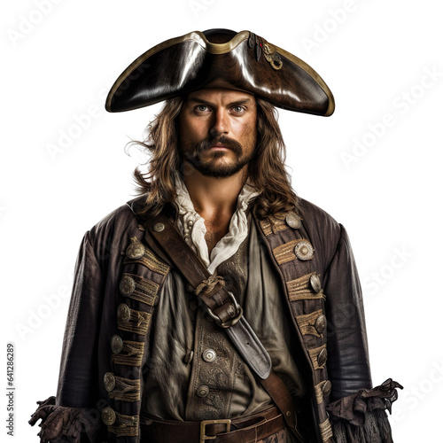 © SuperPixel Inc, Fototapeta premium Halloween costumes - Front view mid shot of white man dressed as pirate isolated on white transparent background