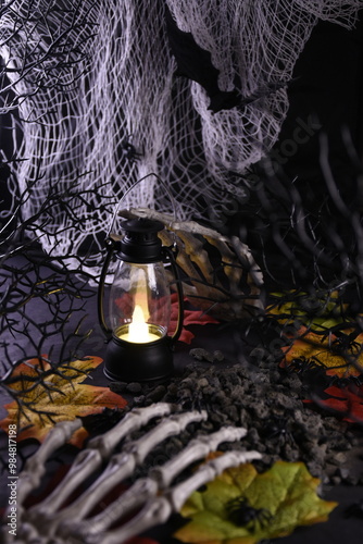 Fototapeta premium Halloween. Creepy screensaver. Decor for the holiday Halloween. Bony hands on...