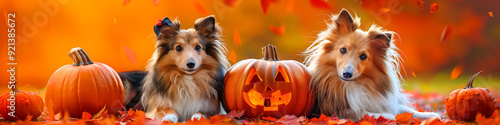 Naklejka premium Halloween cute Shetland Sheepdog Sheltie Collie puppy dog, carved jack-o'-lanterns, pumpkin, banner copy space horizontal