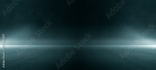 Fototapeta premium Halloween dark blue stage with fog glow neon spotlights, and smoky street floor studio. Abstract futuristic background for concert, product display, banner event design in spooky atmosphere.