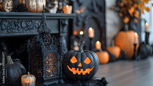 © Teerapat, Fototapeta premium Halloween Decor with Black Pumpkins and Lanterns.
