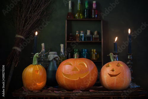 Obraz premium Halloween decoration with pumpkins and magic potions indoor