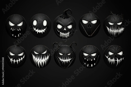 Naklejka premium Halloween face icons with creepy smiles and glowing eyes in a black and white...