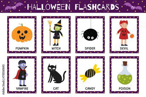 Fototapeta premium Halloween flashcards collection for kids. Flash cards set with cute spooky...