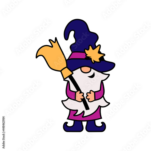 © Natalia, Naklejka premium Halloween gnome, witch gnome with broom on white background. Vector illustration.