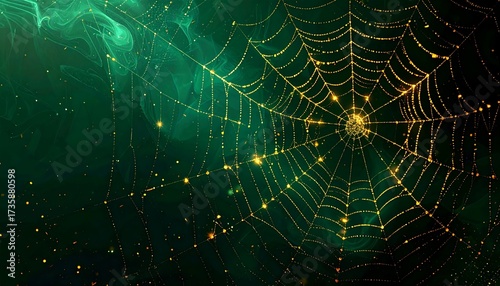 © Olafyu, Naklejka premium Halloween gradient wallpaper with green black tones and golden glowing spider web