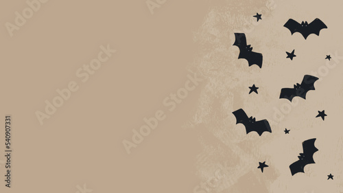 © Magdalena, Naklejka premium Halloween Hand Drawn Vector Background with Black Flying Bats. Little Bats and Stars on a Grunge Dusty Beige Background. Halloween Party Illustration. Top View Composition ideal for Card, Banner.