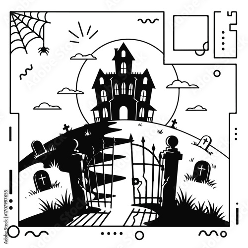 Fototapeta premium Halloween haunted house illustration with graveyard and gate.