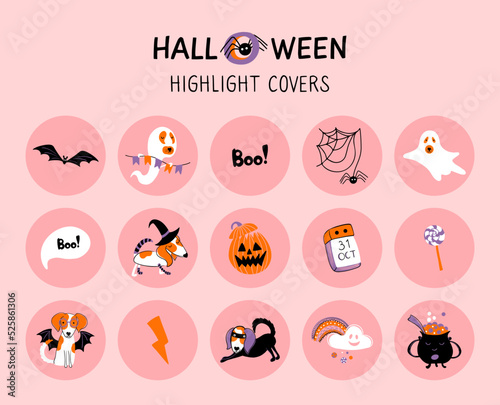 © danielekaterina, Naklejka premium Halloween highlights covers for social media. Set of cute elements in doodle style. Hand drawn icons with dogs in carnival costumes. Stickers, weekly planner. Vector illustration.