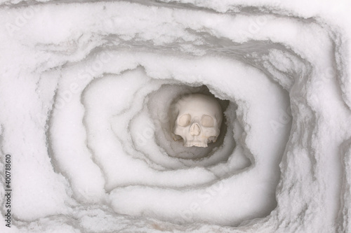 © serikbaib, Fototapeta premium halloween human skull in ice cave