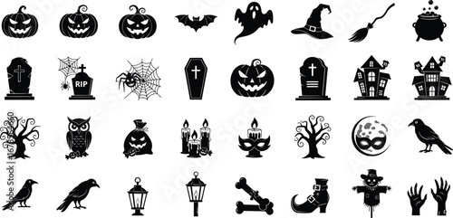 © Asmat, Fototapeta premium Halloween icon set featuring spooky silhouettes of pumpkins, ghosts, bats, witches, cauldrons, graves, spiders, and more