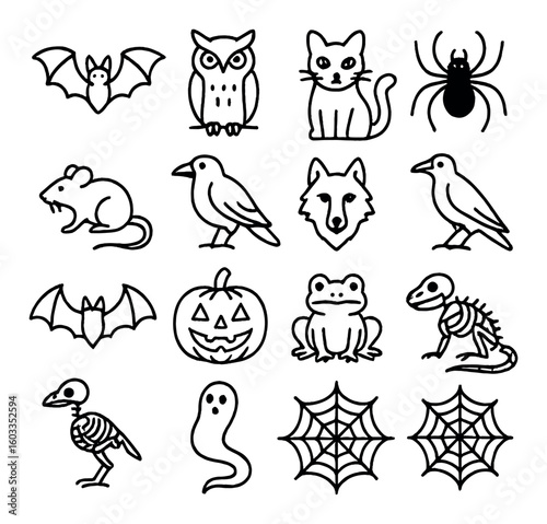 Fototapeta premium Halloween icons: bat, owl, cat, spider, rat, crow, wolf, pumpkin, frog, skeleton, ghost, web