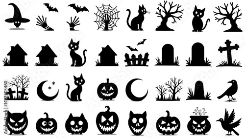 Naklejka premium "Halloween Icons Set – Flat Spooky Symbols of Ghosts, Pumpkins, Witches, and...