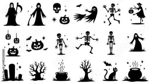 Naklejka premium "Halloween Icons Set – Flat Spooky Symbols of Ghosts, Pumpkins, Witches, and...
