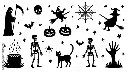 Naklejka premium "Halloween Icons Set – Flat Spooky Symbols of Ghosts, Pumpkins, Witches, and...