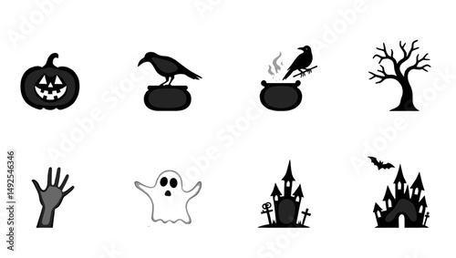 Fototapeta premium "Halloween Icons Set – Flat Spooky Symbols of Ghosts, Pumpkins, Witches, and...